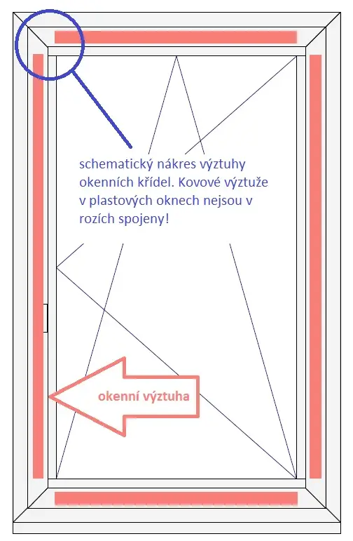 Žádná plastová okna nemají v rozích svařené ocelové výztuhy. Výztuž v okně končí cca 5cm před rohem okna. To znamená, že na svěšování okenního křídla nemá kvalita či síla výztuhy téměř žádný vliv.